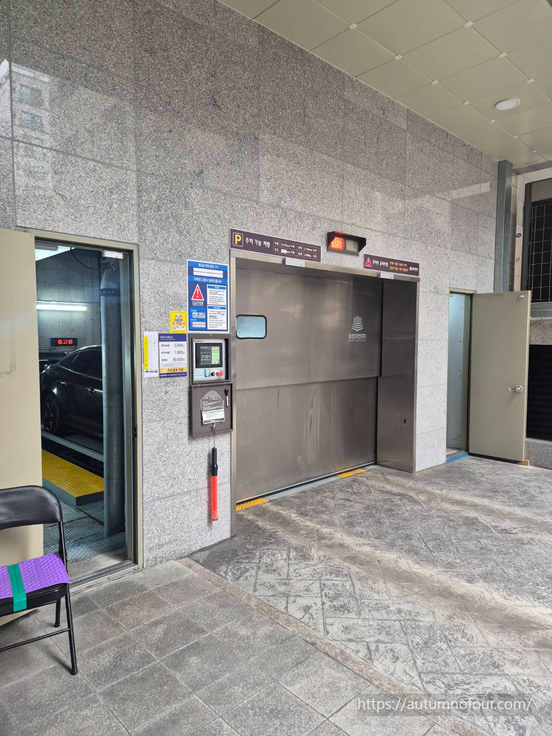 기계식 주차인데 입차하려는 차들, 출차하려는 차들이 서로 엉켜있어서 복잡한데다가 좁다..