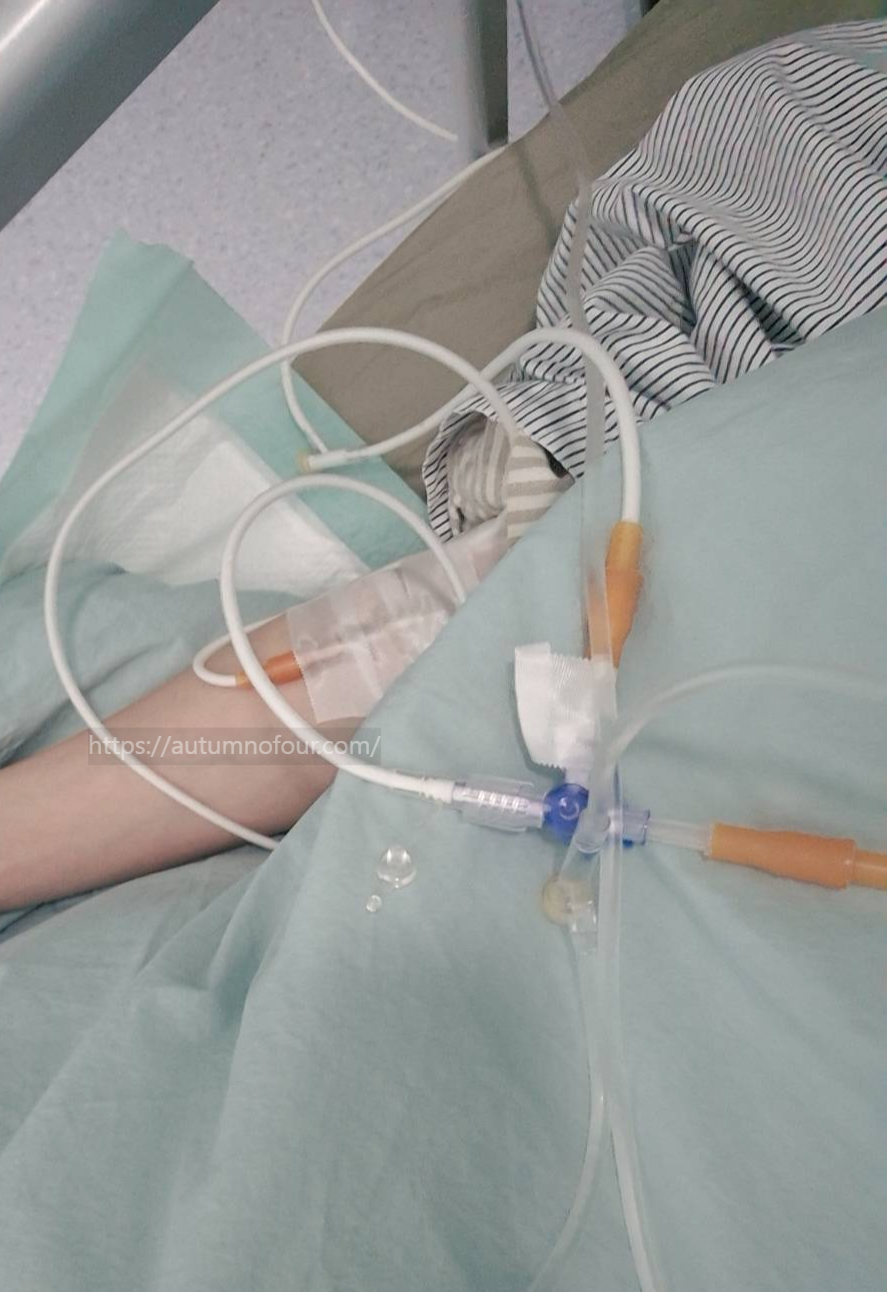 링거처럼 걸어두고 누워서 천천히 맞는 수액주사인데, 이를 위해서 혈관에 바늘을 찔렀다!