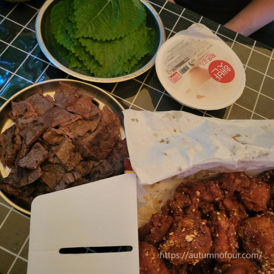 영월 시내에서 사온 닭강정과 소고기로.