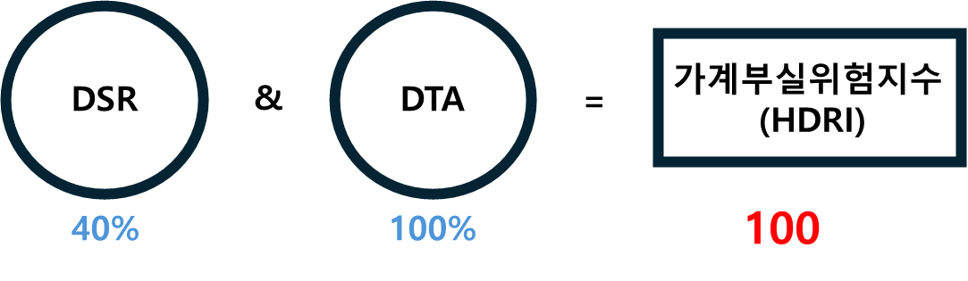 원리금상환비율(DSR) 40% + 부채/자산비율 (DTA) 100% = 가계부실위험지수 (HDRI) 100