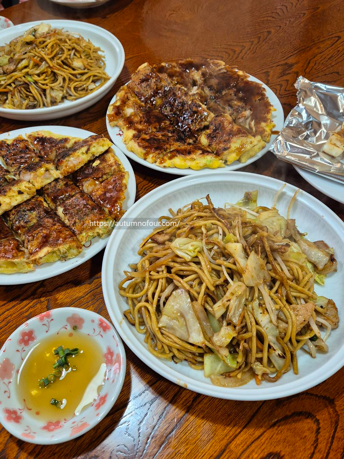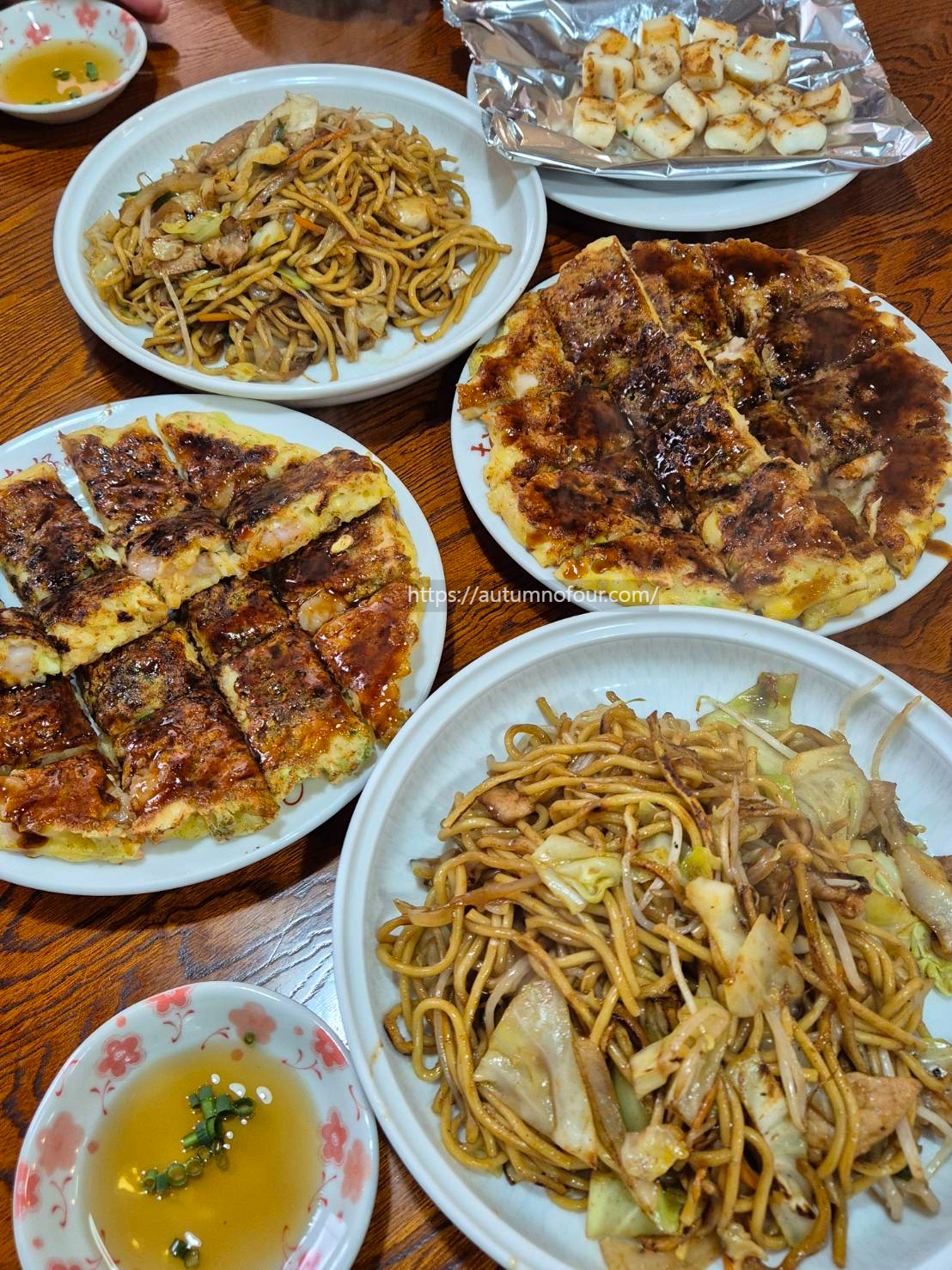 새우 오코노미야끼, 소고기 오코노미야끼, 야끼소바를 한상 가득 주문했다.